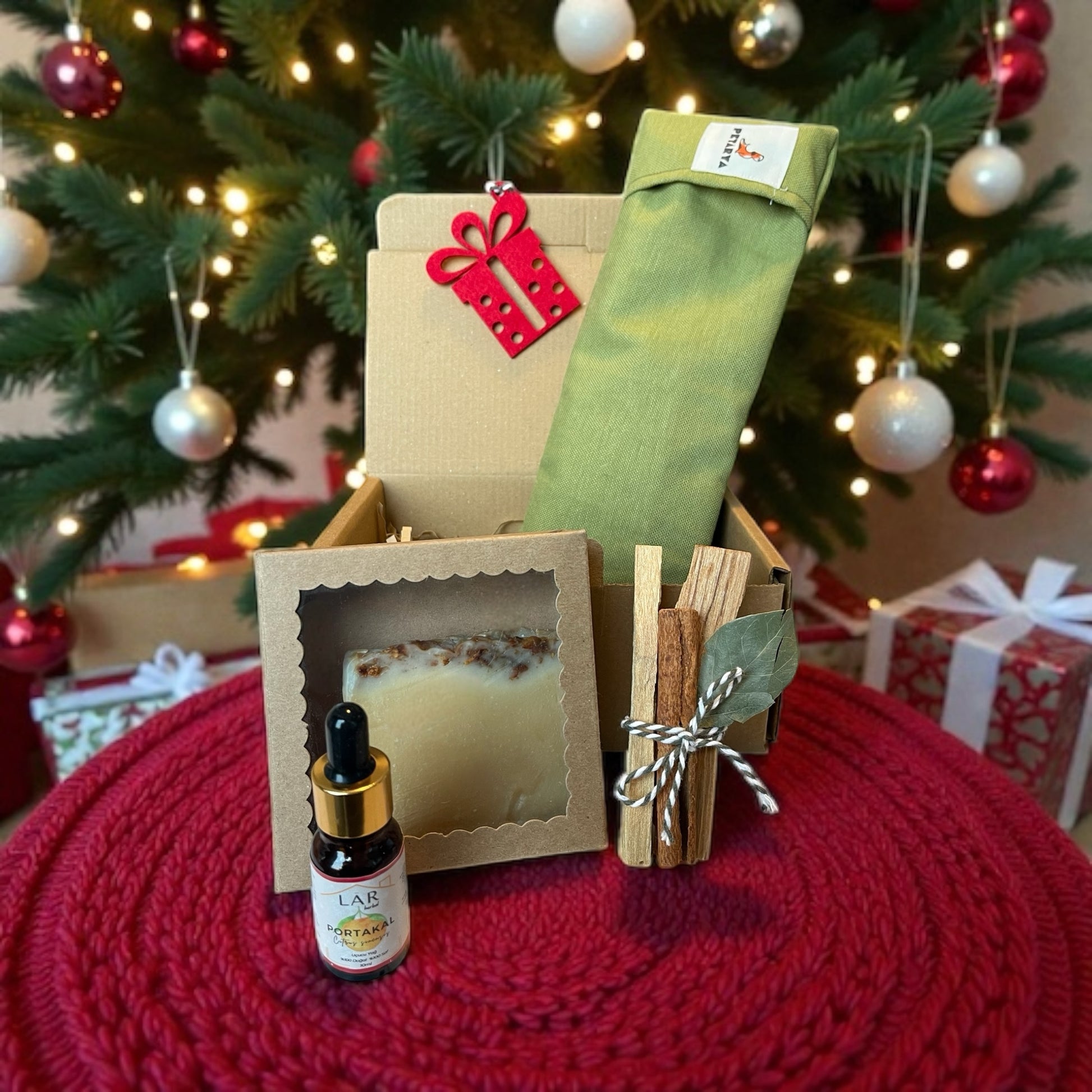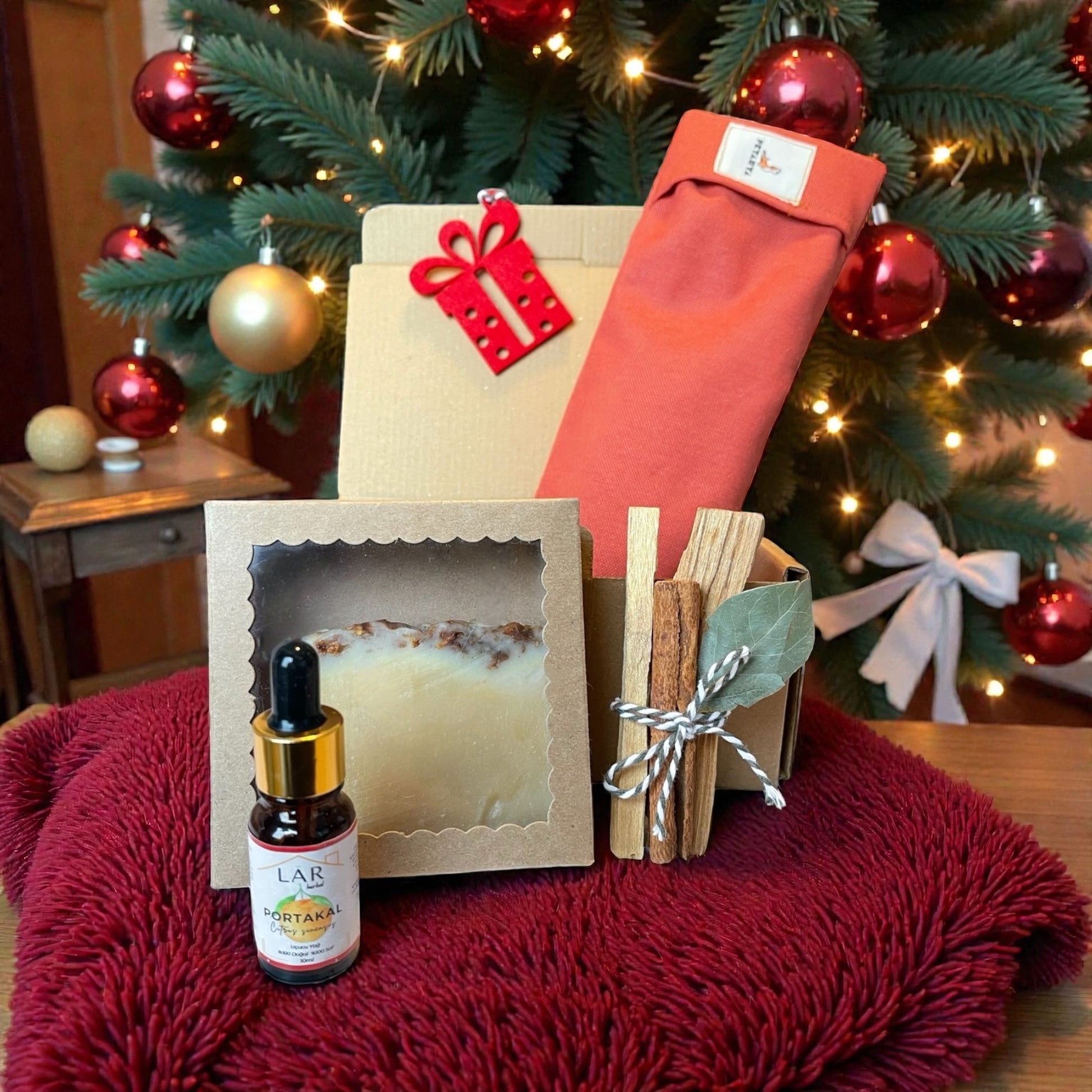 Yeni Yıl Hediye Seti - Portakal Uçucu Yağı + Göz Minderi + El Yapımı Sabun + 2 adet Palo Santo